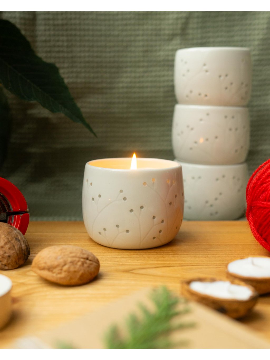 Spojily jsme síly s keramičkou Darinou, která pro mě vytvořila krásné porcelánové kalíšky s designem mé značky. Jsou čistě bílé a ozdobné tečky prosvítají, když se svíčka zapálí.