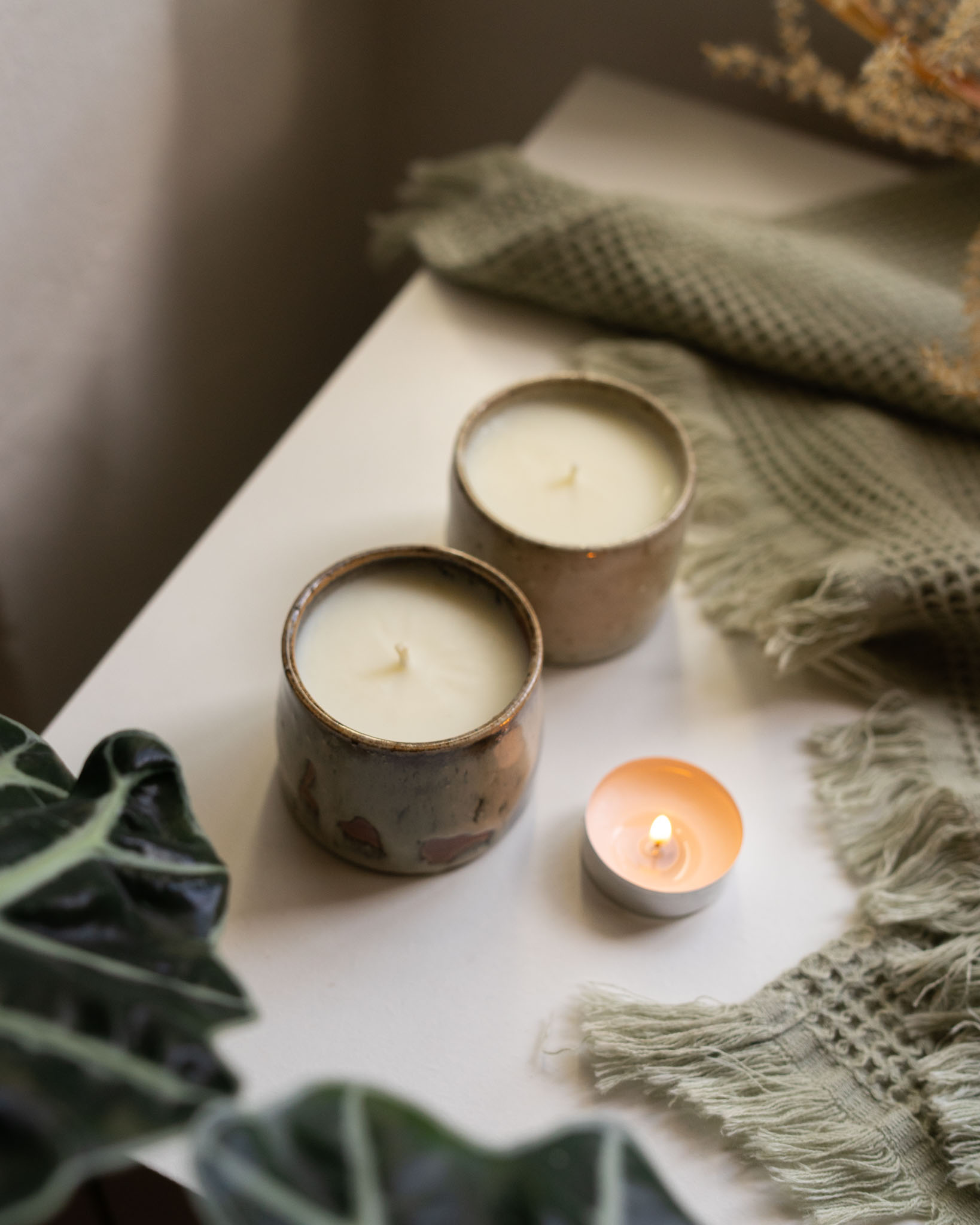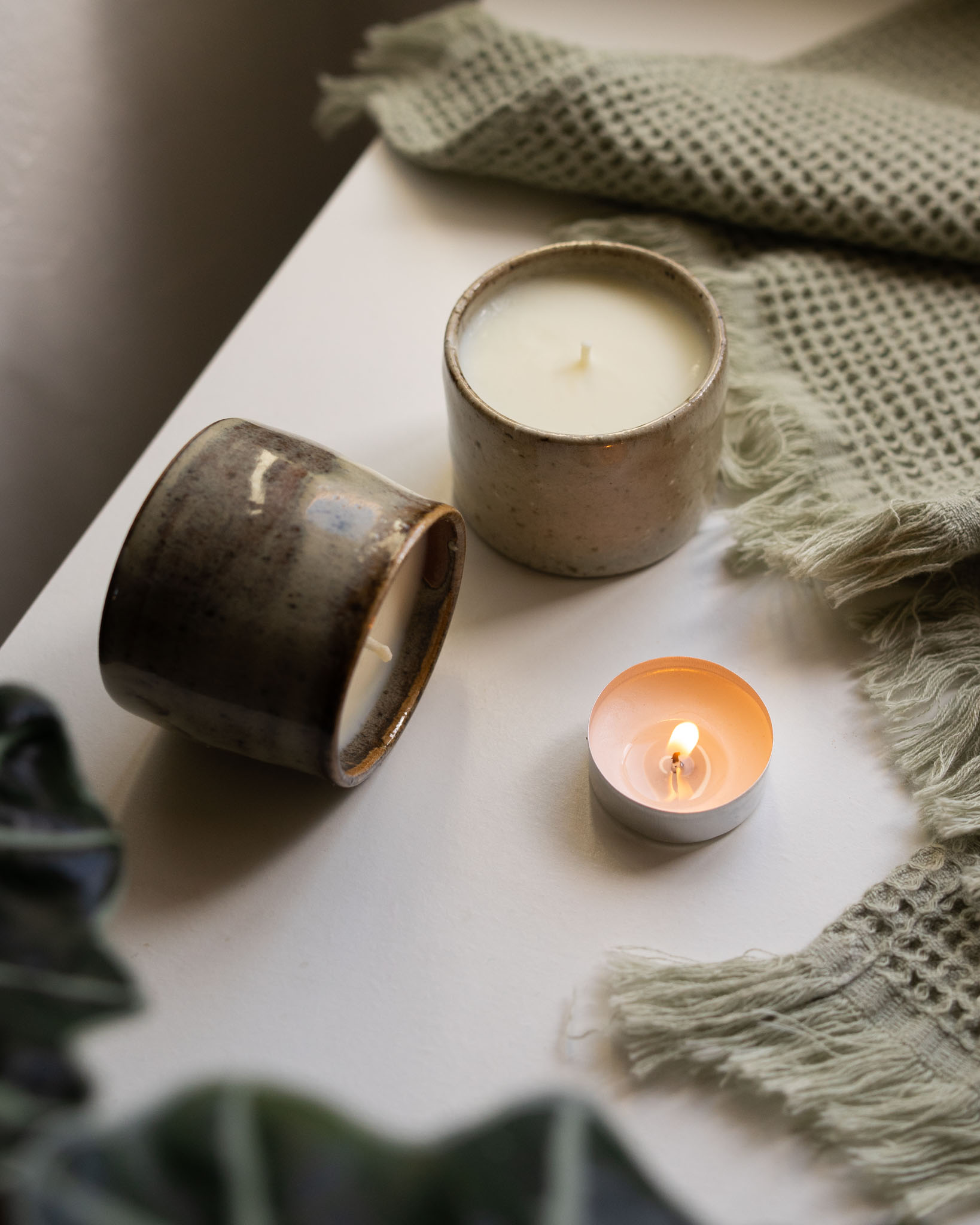 Tři kousky mají na sobě skvrny, kde glazura stekla, je to takový polibek ohněm, nejistota keramické profese a opravdovost, kterou jsem se i tak rozhodla naplnit svíčkami. Tyto kalíšky jako kdyby měly vitiligo… skvrny neprosakují, tudíž se není třeba bát, je to jen estetická (vada).