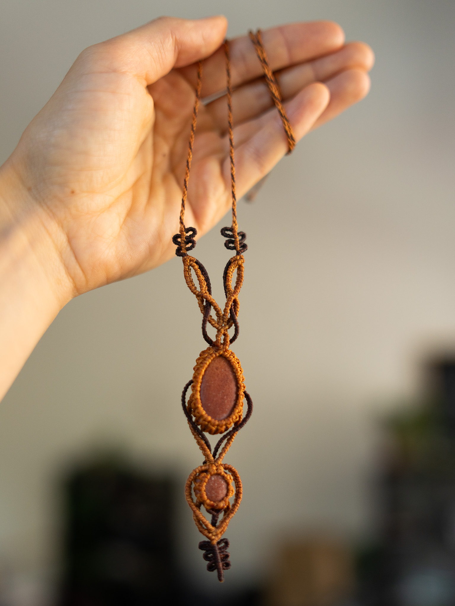 Moře na krk, nekonečné pláže, hukot vln a slunce, to vše je pečlivě polapeno v síti uzlíků mých micromacrame šperků. Drhaný náhrdelník Dva je výrazně zdobným náhrdelníkem se dvěma kamínky a drobnými drhanými lístečky.