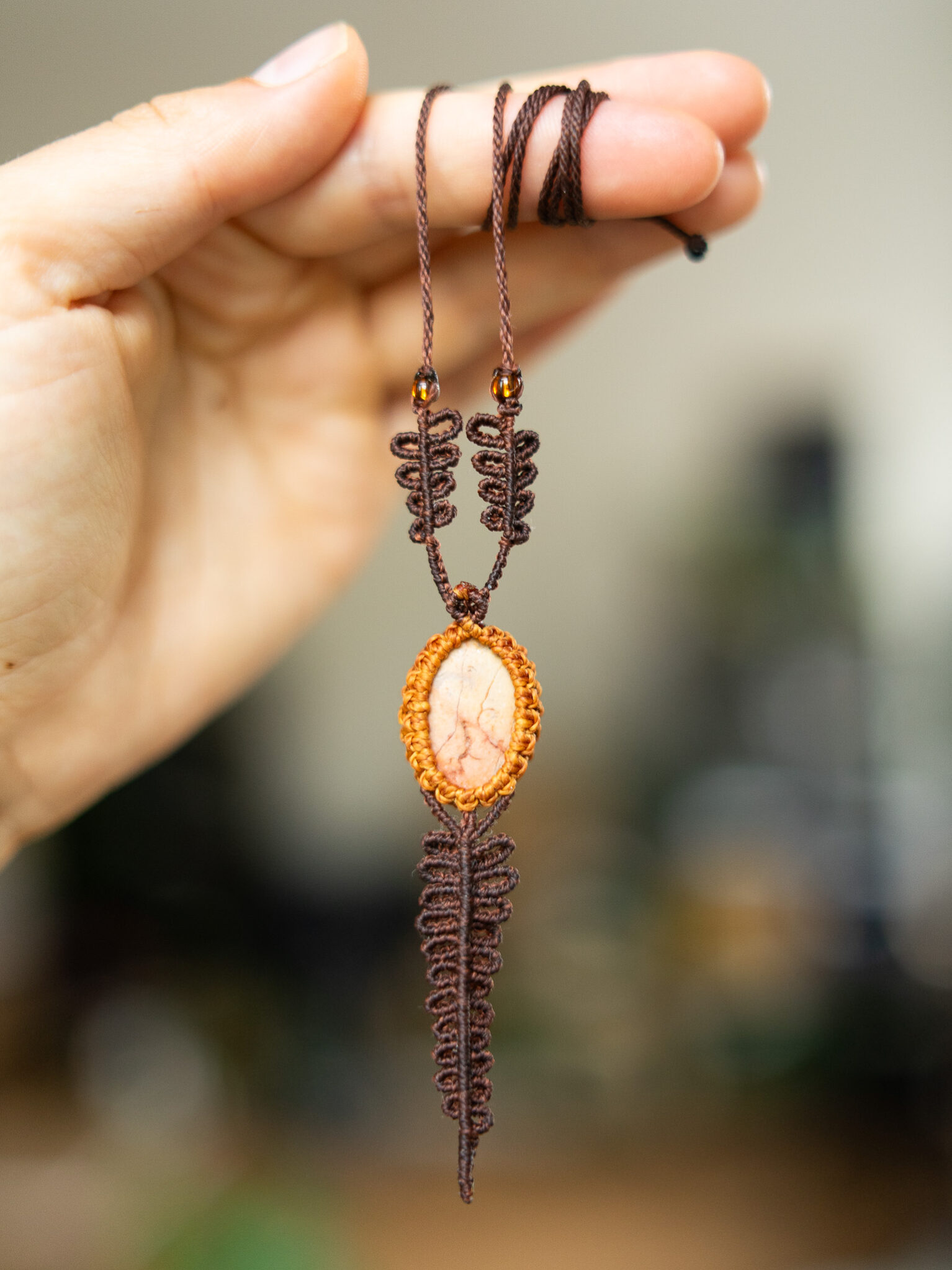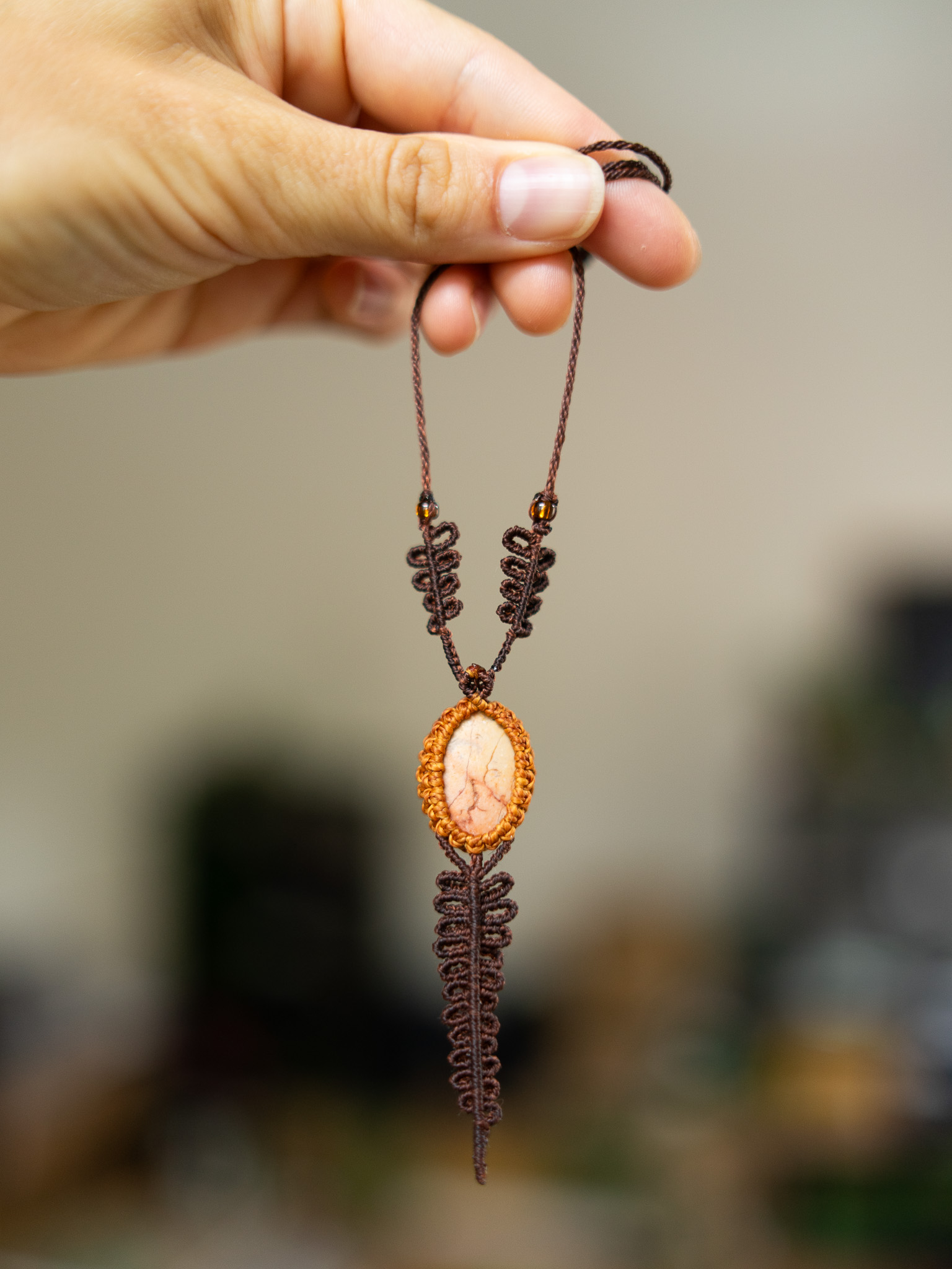 Moře na krk, nekonečné pláže, hukot vln a slunce, to vše je pečlivě polapeno v síti uzlíků mých micromacrame šperků. Drhaný náhrdelník Indiánský je šperkem, který speciálními výběrem tenké příze a tudíž i jemnějšími detaily, kamínek je doplněn o dva skleněné korálky.