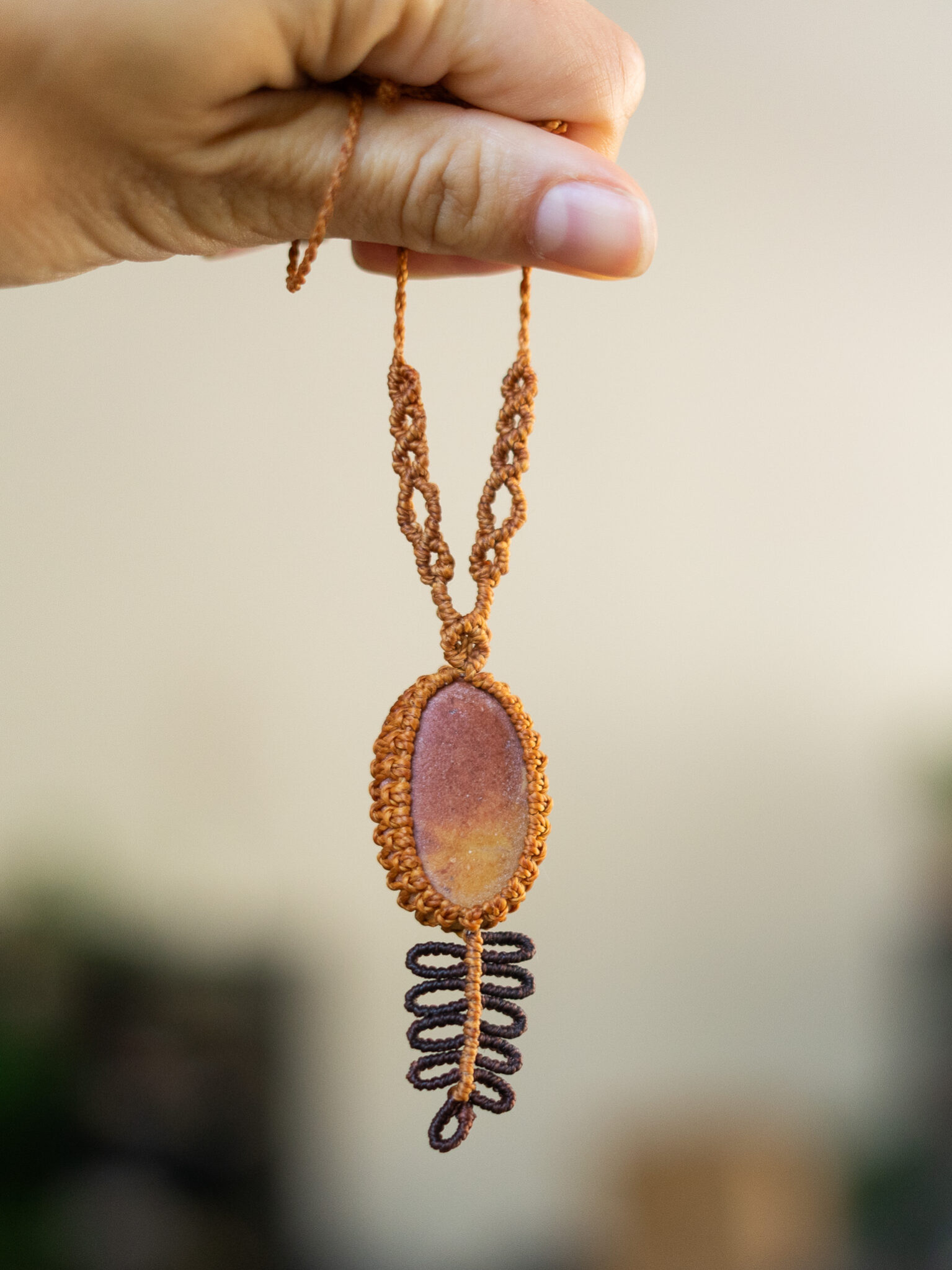 Moře na krk, nekonečné pláže, hukot vln a slunce, to vše je pečlivě polapeno v síti uzlíků mých micromacrame šperků. Drhaný náhrdelník Ombré list má krásný dominantní kímen v červeno-okrových barvách.
