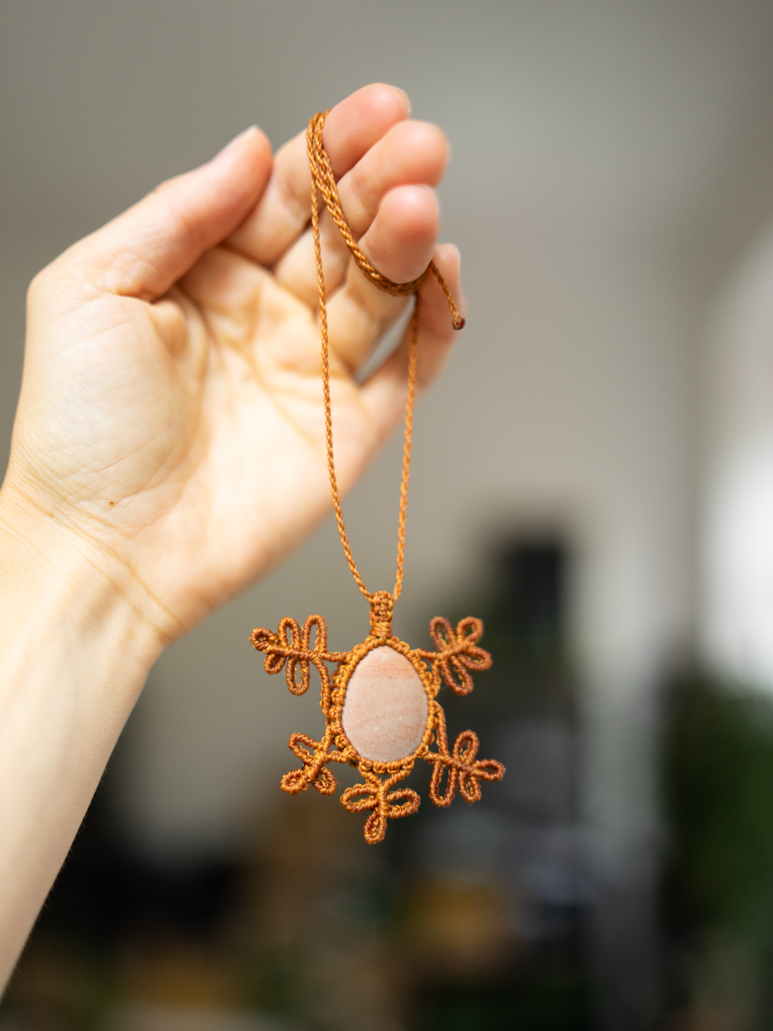Moře na krk, nekonečné pláže, hukot vln a slunce, to vše je pečlivě polapeno v síti uzlíků mých micromacrame šperků. Drhaný náhrdelník Rostliny je zdobnější variantou řady „Simple“, kamínek z pláže zde zdobí řada rostlinek.