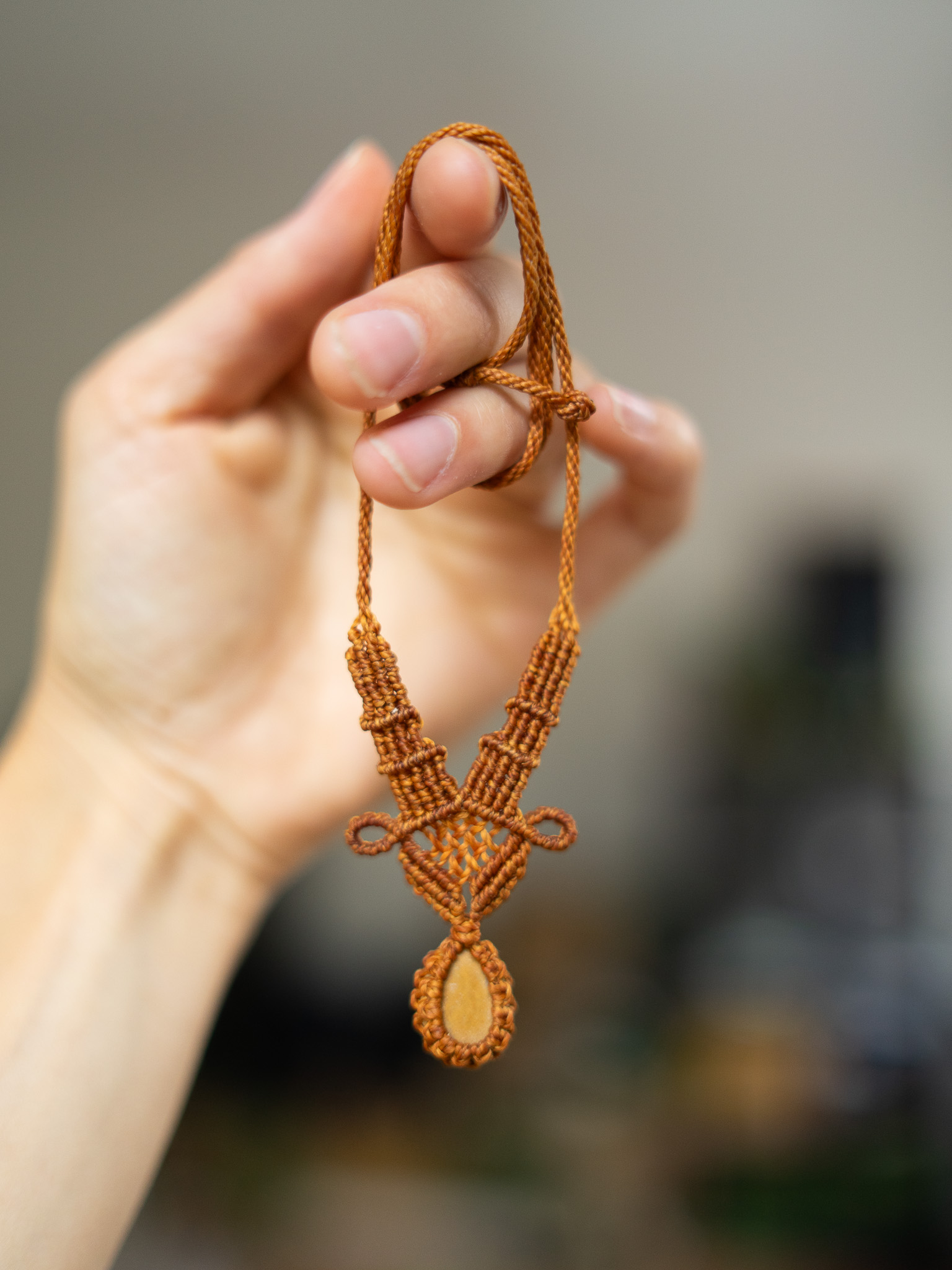 Moře na krk, nekonečné pláže, hukot vln a slunce, to vše je pečlivě polapeno v síti uzlíků mých micromacrame šperků. Drhaný náhrdelník „V“ je jemným šperkem s malinkým kamínkem.