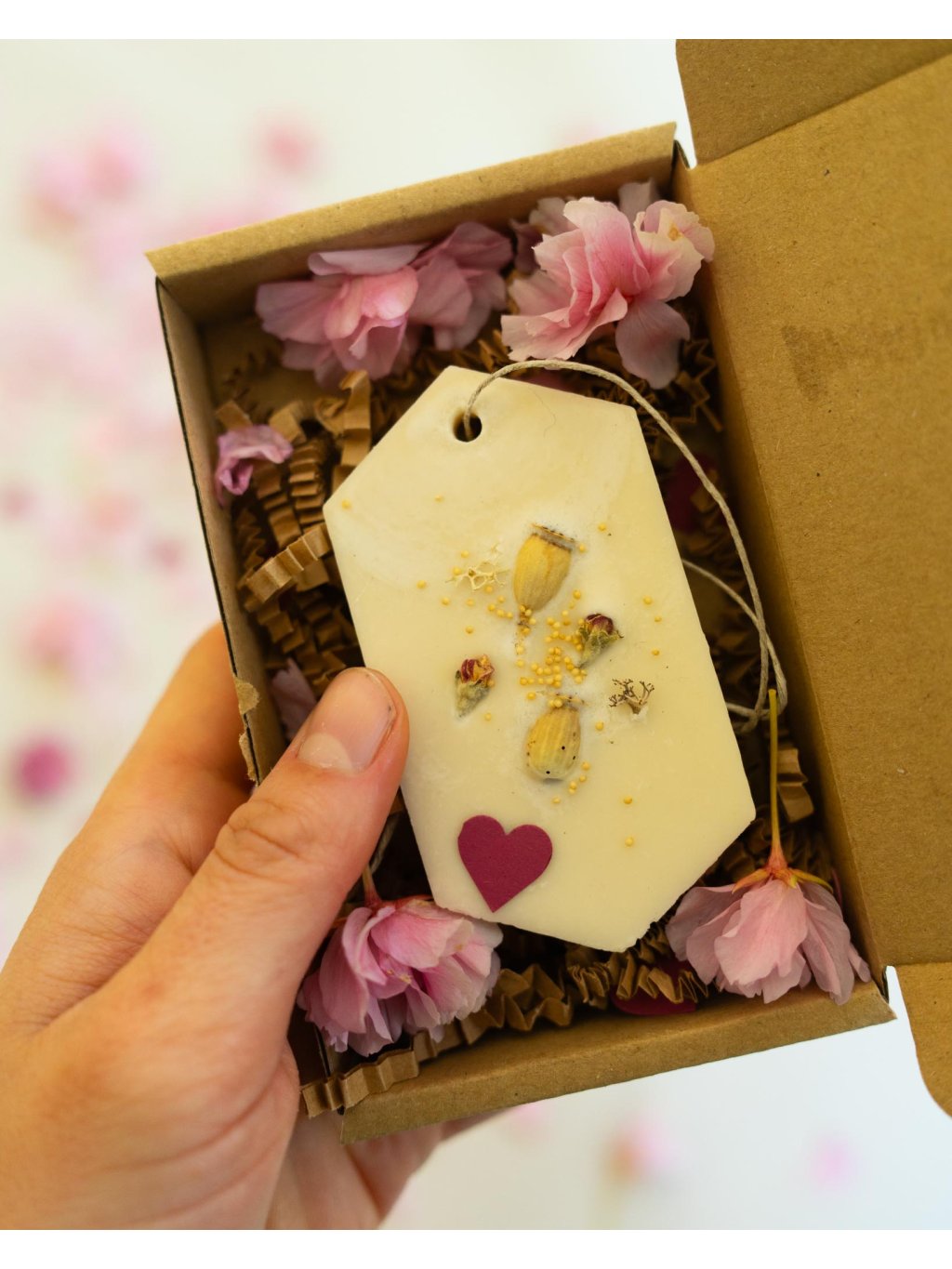 Dárkový box plný přírodní vůně s papírovými konfetami ve tvaru srdce, s růžovou mašlí. Do tohohle balíčku jsem se pokusila dostat tolik krásy a něhy, kolik se tam jen vešlo, nicméně konečný výběr vůní je jen a jen na tobě.